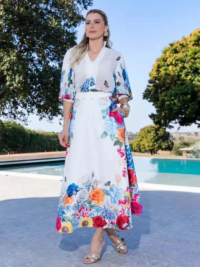 Camisa: Confeccionada em chiffon com estampa floral exclusiva, apresenta modelagem ampla e mangas ¾ plissadas bufantes, trazendo leveza e sofisticação. A gola alta com acabamento de babadinho e o decote V valorizam o colo, enquanto o abotoamento frontal com botões encapados garante delicadeza ao visual. Composição: 100% poliéster.