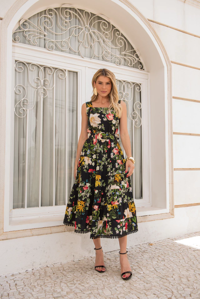 Vestido Sunamita, comprimento midi, confeccionado na viscose floral estampa exclusiva. Elástico na cintura. Acompanha cinto.