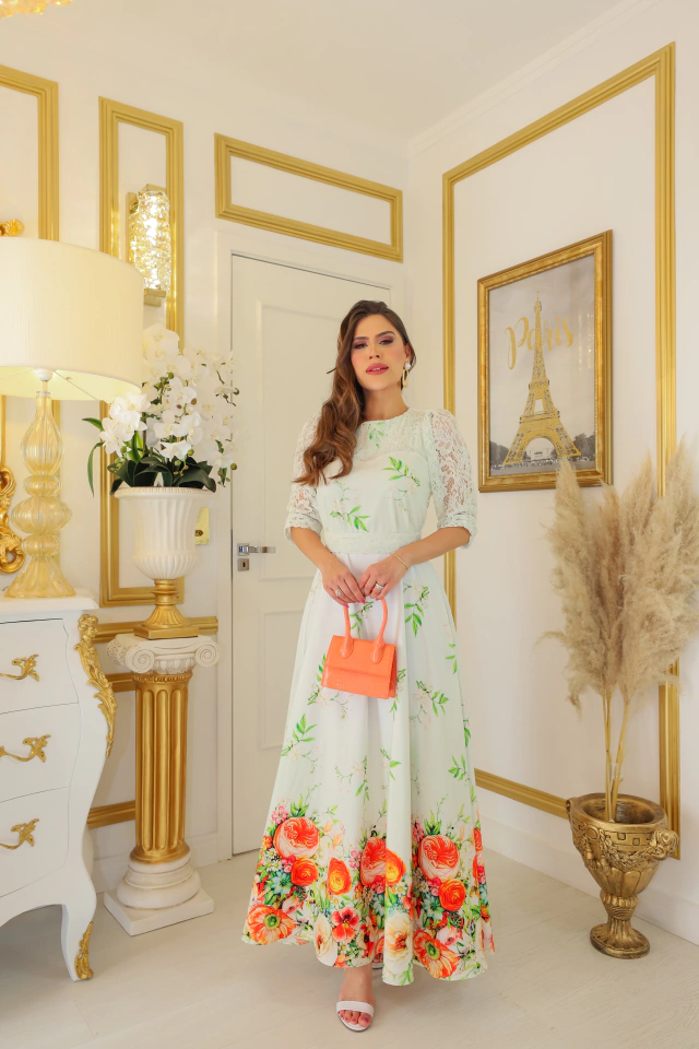 Vestido comprimento maxi midi, confeccionado no crepe com barrado floral exclusivo e detalhes em renda. Acompanha faixa de renda. Modelagem grande.
